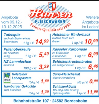 Neu in Bordesholm, bei Hansen Fleischwaren Feinste Qualität seit 1938 Einkauf 24/7 im Verkaufsautomaten direkt vor dem Laden! Bahnhofstraße 107 • 24582 Bordesholm